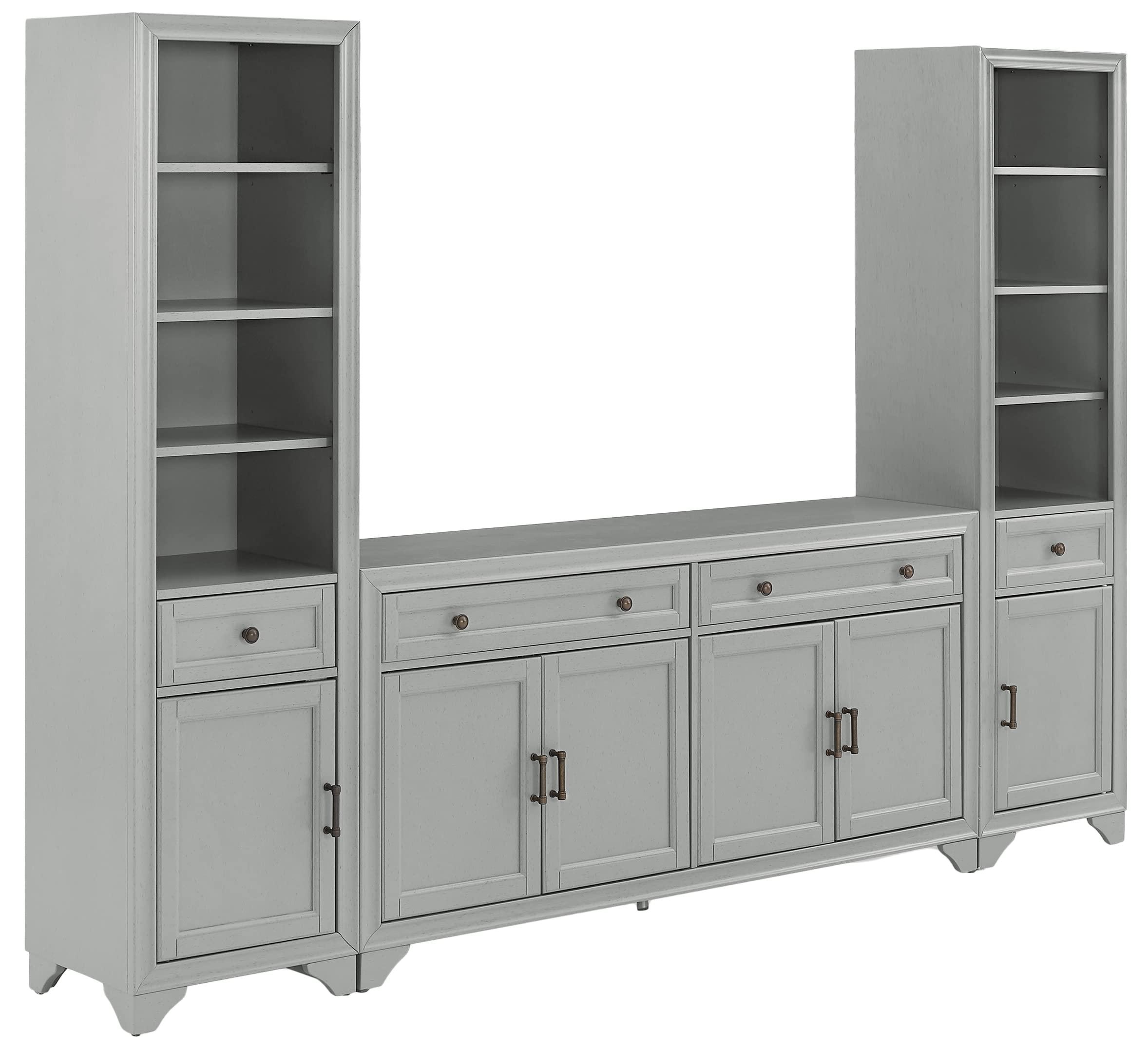 Whether you love a traditional look or a modern farmhouse vibe, the Tara 3pc Entertainment Set is a stylish take on a classic entertainment center. The sideboard features two wide full-extension drawers and two large cabinets with adjustable shelves. Each bookcase has a full-extension drawer and three open adjustable shelves. The Tara 3pc Entertainment Set is a great storage option for framing large TVs up to 65".