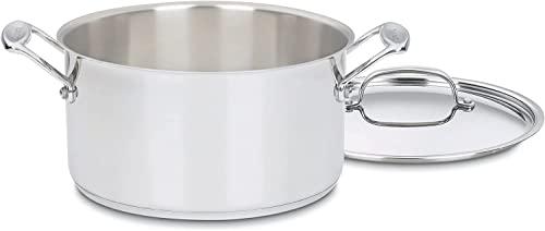 Cooks shopping for a midweight stainless-steel sauce pot at a mid-range price may well have found their match with this multi-functional pot from Cuisinart. The gleaming 6-quart pot is equipped to handle the most frequent cooking tasks such as simmering soups and boiling pasta. Like all of Cuisinart's Chef's Classic cookware, this pot is made of stainless steel that has been polished to a brilliant mirror finish and that won't react to acidic foods. An inner core of aluminum ensures that foods heat quickly and evenly. The stainless-steel handles stay cool on the stovetop and the matching mirror-polished stainless-steel lid has a dripless rim for easy pouring. All cookware in Cuisinart's Chef's Classic line is oven-safe up to 550 degrees Fahrenheit and is covered by a limited lifetime warranty.
