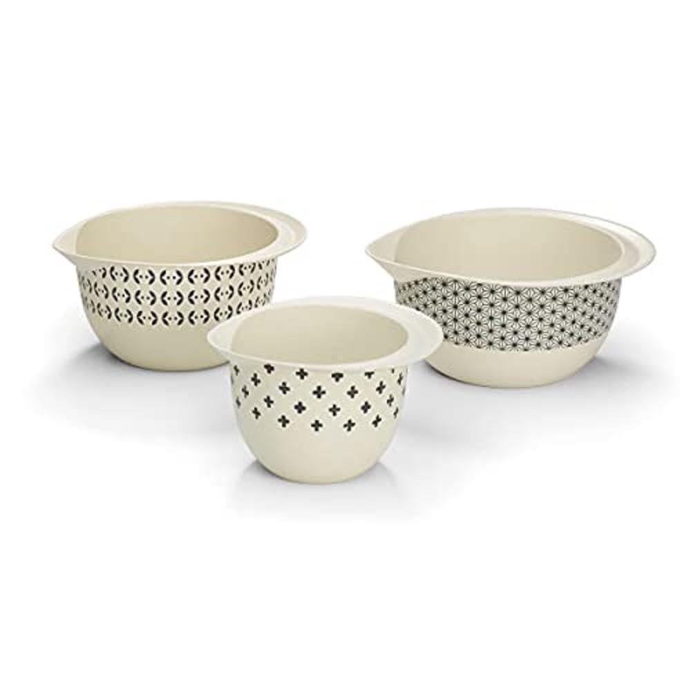 Mixing made easyand safe for the environment! Crafted from bamboo fiber, this eco-friendly set of 3 mixing bowls has little or no environmental impact. But theyre sure to make a positive impact in your kitchen as you prep, mix, and serve a variety of foods. Backed by a lifetime warranty, this stylish and versatile set made from a renewable resource includes 2 qt., 3.5 qt. and 4.5 qt sizes. Each bowl features a wide handle and spout for easy pouring and is dishwasher safe for easy cleaning.