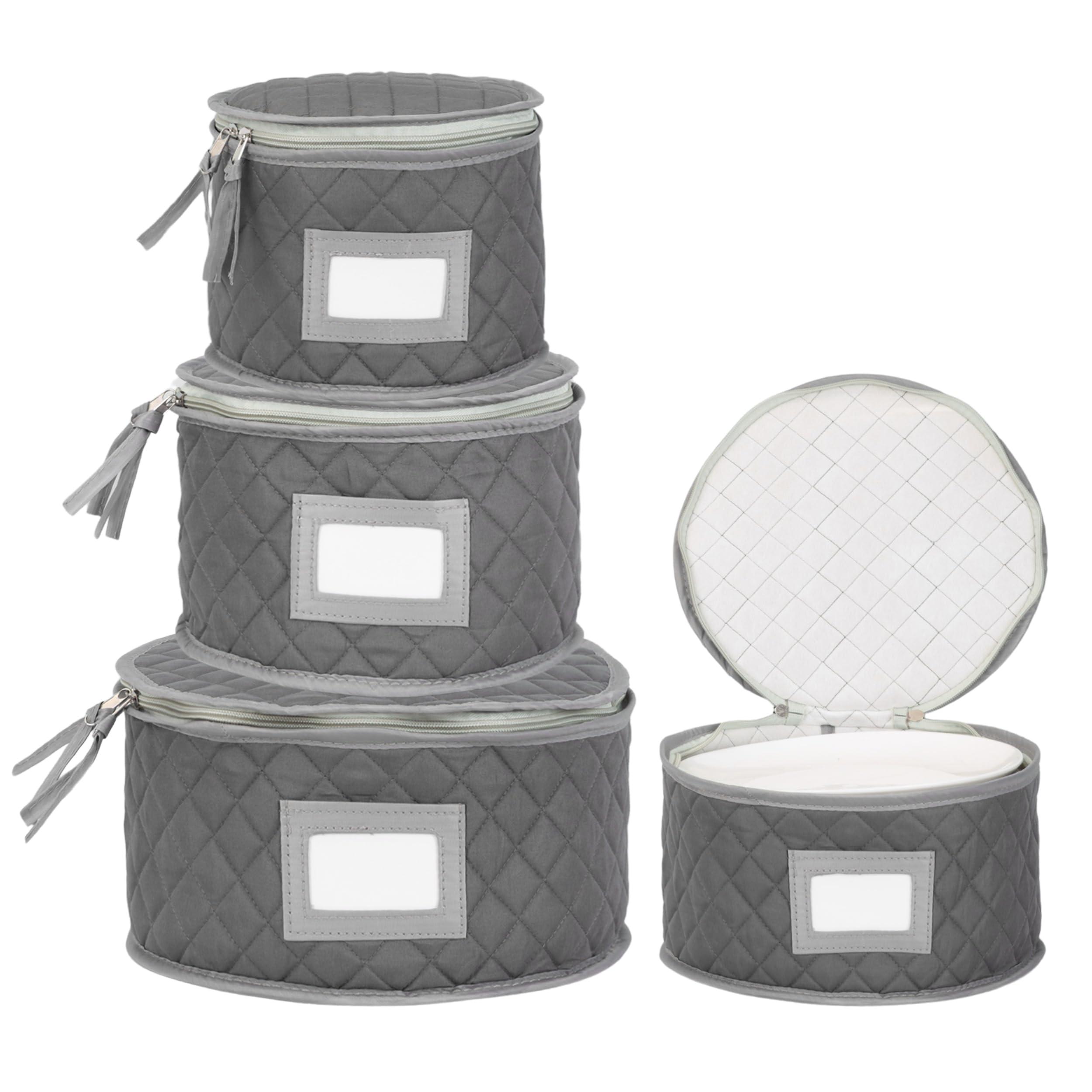 - PREMIUM DINNERWARE STORAGE - Set includes 4 storage containers for china to hold a total of 48 plates: one 12" case for 12 dinner plates - one 10" case for 12 salad plates - one 8" case for 12 dessert plates or bowls and one 7" case for 12 saucers. Set also includes 48 felt plate separators for protection against chipping/scratching.