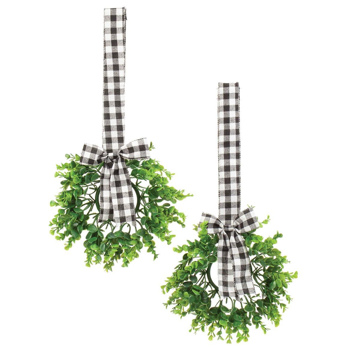- 12" dia. miniature wreaths feature artificial greenery hanging from black and white gingham ribbons and bows to add lively style that's perfect for any season
