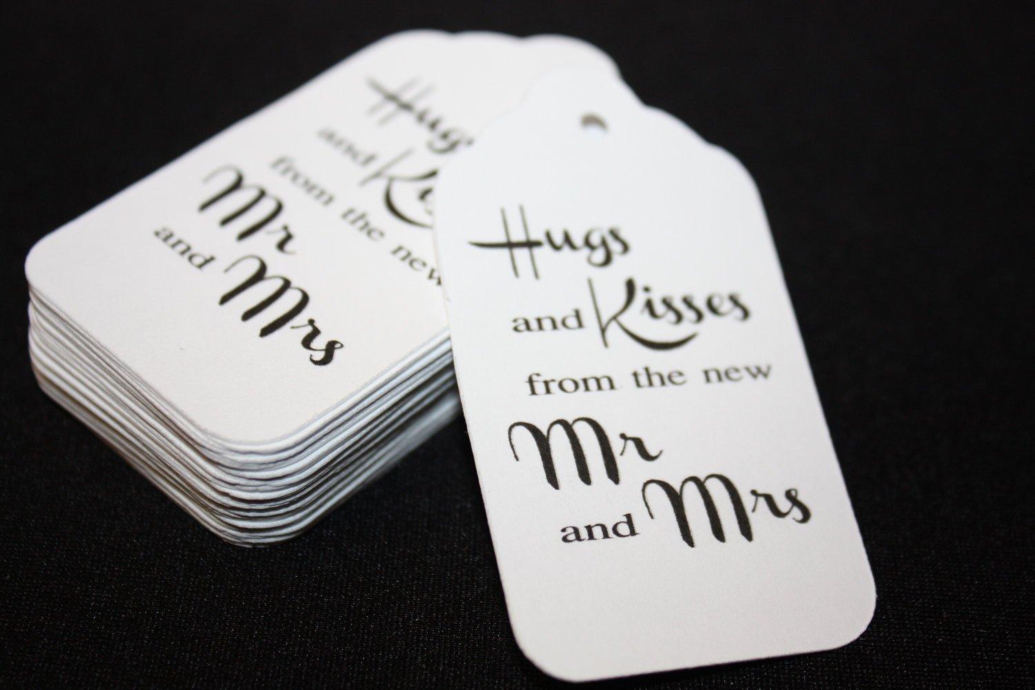 Printed with words Hugs and Kisses from the new Mr and Mrs.white card stock favor tags. set of 50 White Tags .........Hole punched. No String. Size of tag is approx 1 3/8 x 2 1/2 inches All products are handmade, using with bright white 100lb wt card stock.........THANK YOU for buying handmade!