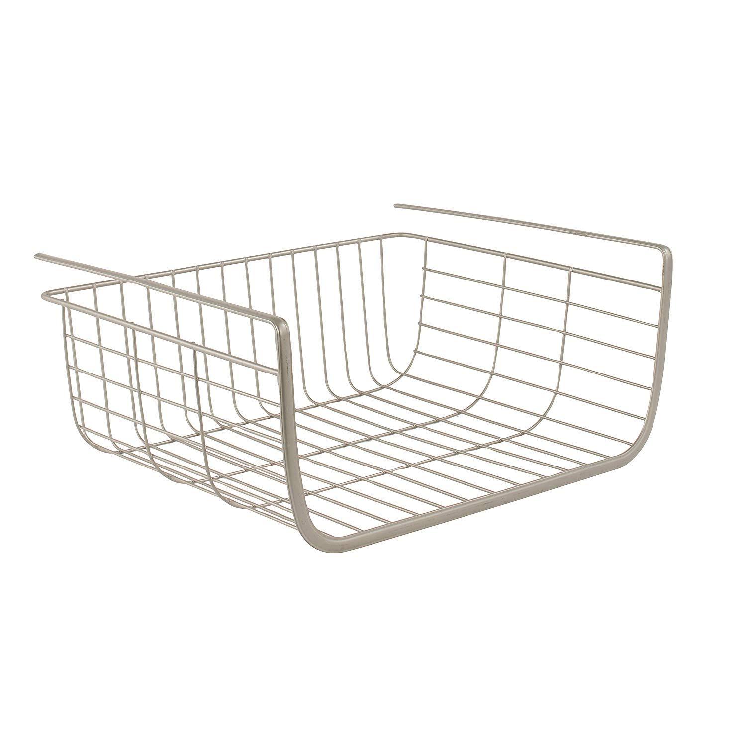 Add extra storage space to your kitchen or bathroom cabinets with the Ashley Over the Shelf Basket from Spectrum Diversified. Wide support bars allow the basket to hang sturdily under a shelf while the large opening creates easy access to store and remove items. Add extra storage without all the hardware. Padded brackets slide easily over cabinet shelves for quick, no fuss installation. No tools required. Perfect for apartments, rental homes, or RVs. Add another shelf to your cabinet! Arms slide easily over cabinet shelves, extending storage in your bathroom, kitchen or pantry. Holds non-perishable food, canned goods, bath essentials, coffee and tea accessories and more. Open wire design allows you to see the items inside the basket, which makes it easy to find your essentials. Keep your bathroom and kitchen cabinets organized without sacrificing easy access. Whether it holds spice jars, canned goods, sandwich baggies, or other frequently used items, this basket will prove to be unbelievably useful. Keep all the essentials within easy reach for your guest; ensure they know where the spare shampoo, soap, and towels are. Keep them in a beautiful basket to impress with style and organization. Celebrate form, function, and style with one uniform look. The modern lines and classic finishes create a traditional appearance with modern flair. Designed to coordinate with a variety of bathroom fixtures. Made of sturdy steel.