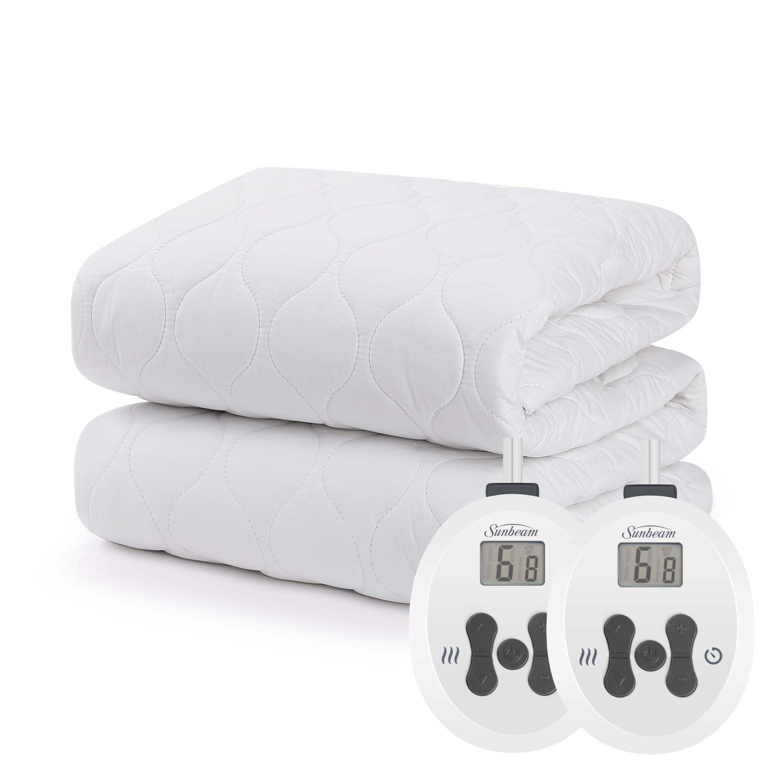 Sleep comfortably with the Sunbeam Restful Quilted Water Resistant Heated Mattress Pad. This easy-to-use mattress pad comes equipped with a digital controller with 12 heat settings to accommodate all your comfort needs. Simply adjust the warmth using the detachable digital controllers. This mattress pad's vertical quilted polyester top is sure to keep you cozy all night long. Fall asleep with peace of mind thanks to the bult-in 12-hour selectable auto-shut off function. Remove controllers and place mattress pad in the washer and dryer for easy maintenance.
