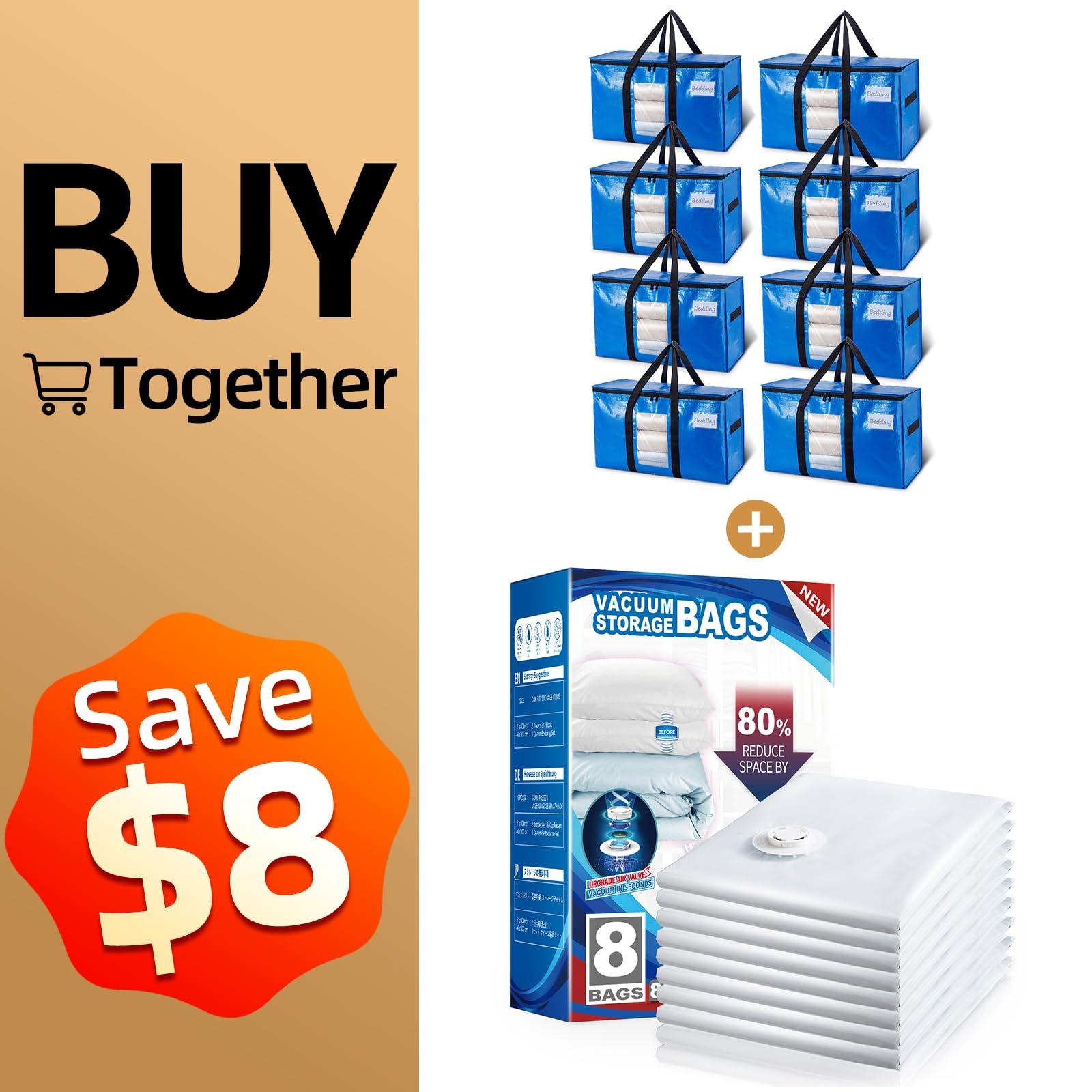 - Product contents included: 8 pack moving tote bags 28 L x 14 W x 17 H- up to 100 Liter + 8 pack (40x31 inch) jumbo vacuum bags
